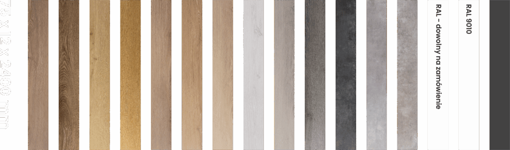 Listwy ACQUATEK dostępne są we wszystkich kolorach pasujących do dekorów podłóg z serii ACQUATEK. Możliwe jest też zamówienie listew w dowolnym kolorze z palety RAL, co stwarza nieograniczone możliwości w aranżacji wnętrz!